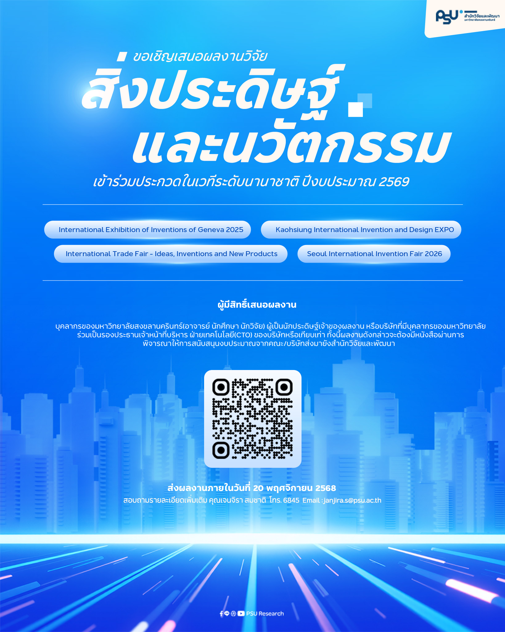 สามารถสอบถามรายละเอียดเพิ่มเติมได้ที่คุณเจนจิรา สมชาติ โทร 6845 E-mail: janjira.s@psu.ac.th