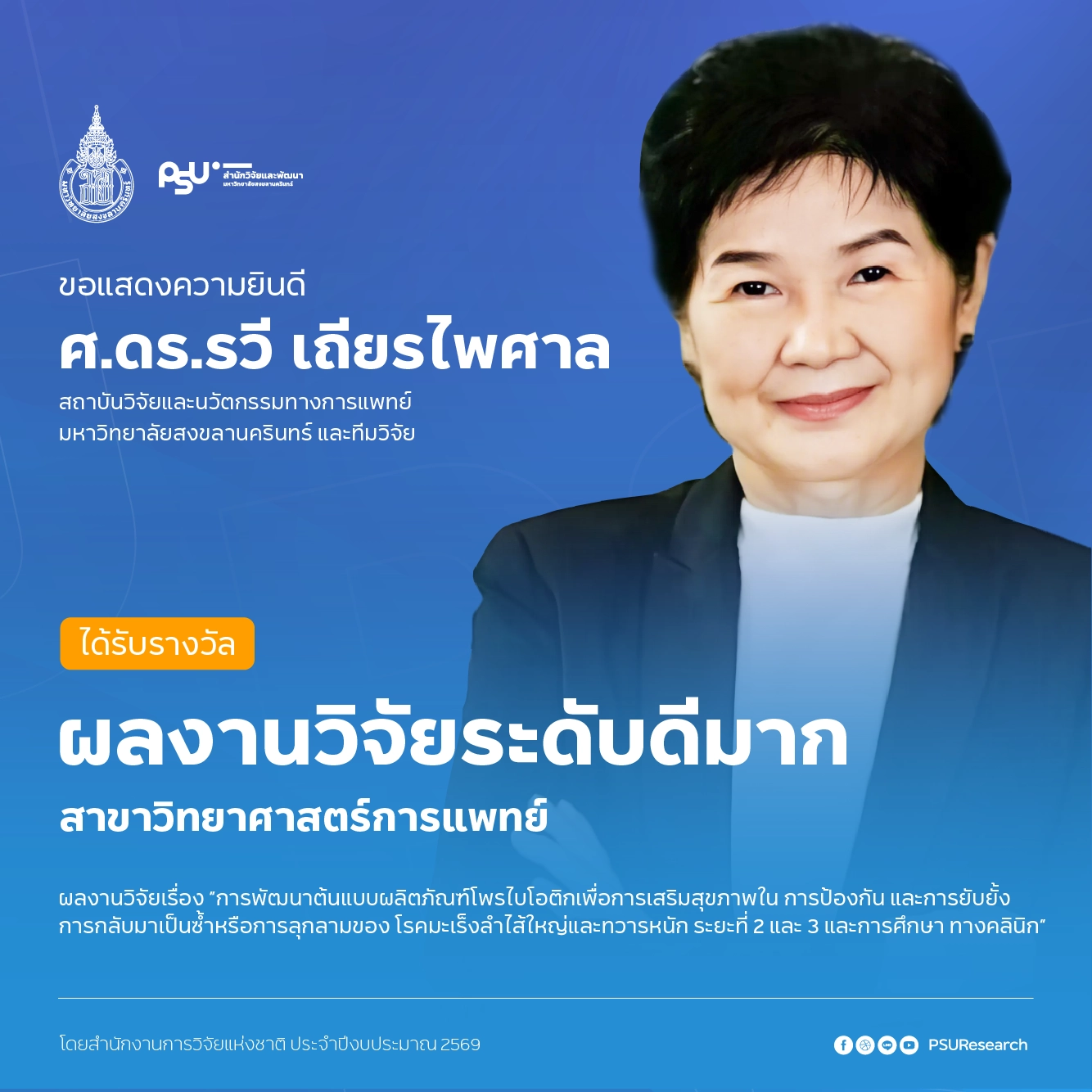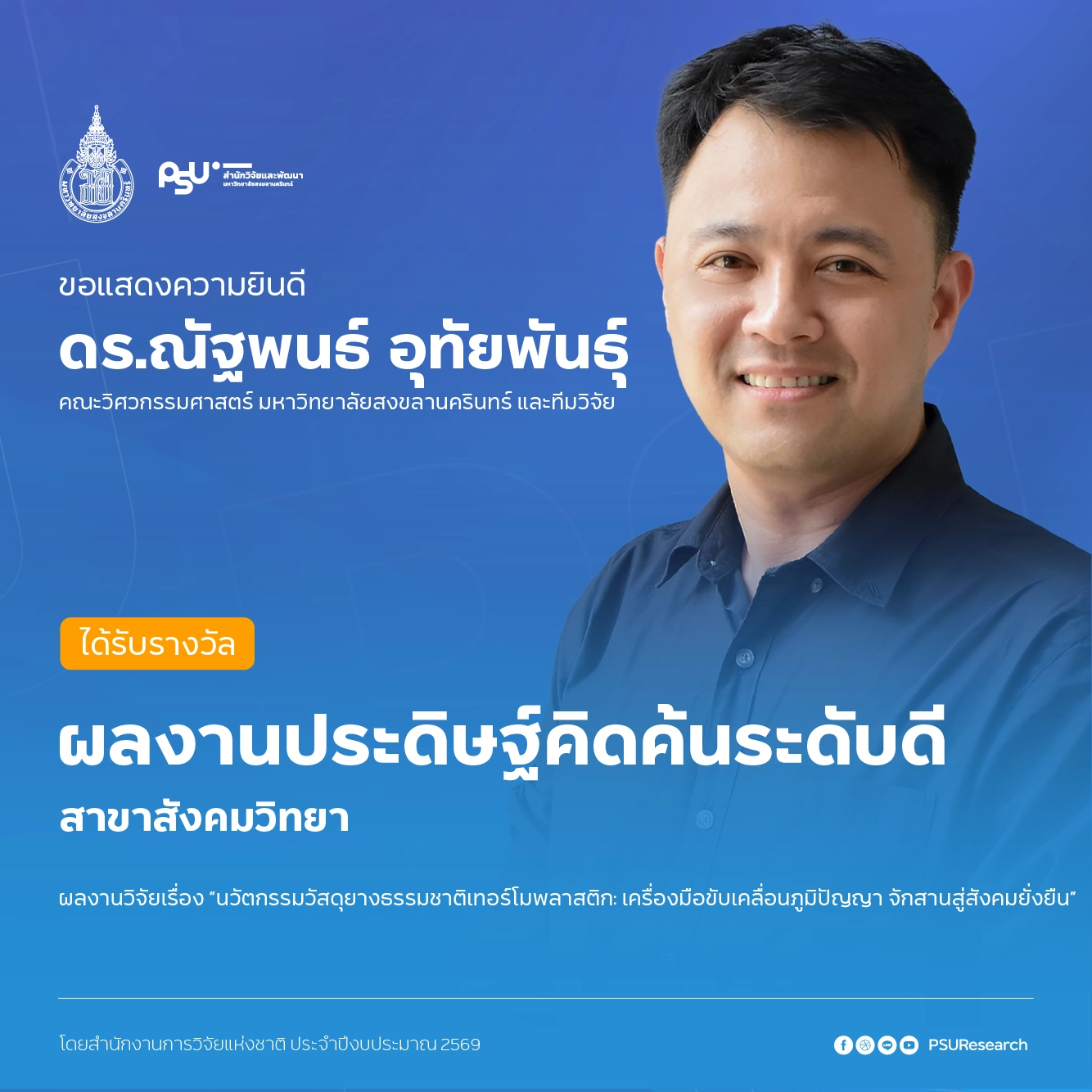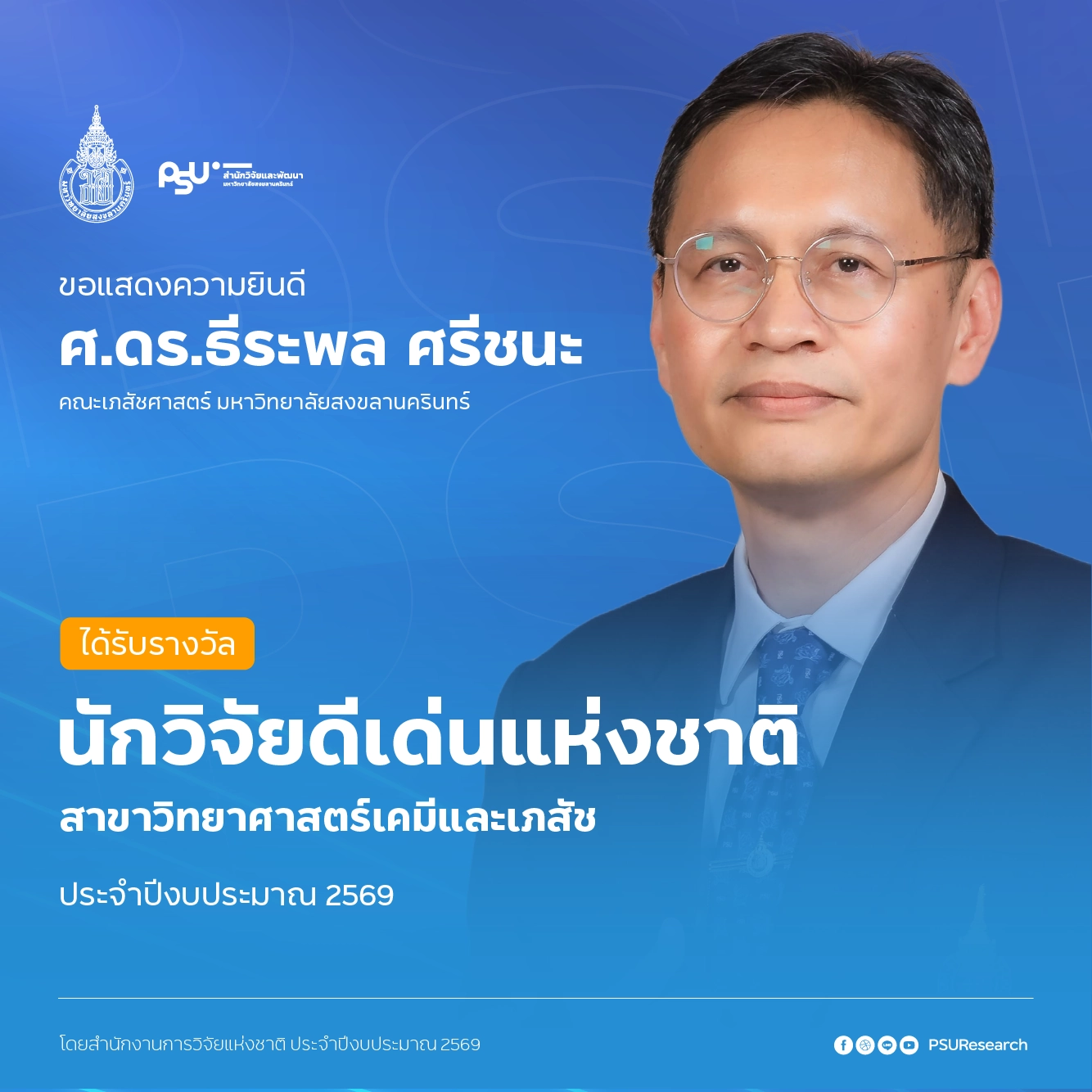 มหาวิทยาลัยสงขลานครินทร์ (ม.อ.) สร้างประวัติศาสตร์ความภาคภูมิใจบนเวทีระดับประเทศอีกครั้ง หลังจากสำนักงานการวิจัยแห่งชาติ (วช.) ประกาศผล “รางวัลการวิจัยแห่งชาติ ประจำปีงบประมาณ 2569” อย่างเป็นทางการ โดยในปีนี้บุคลากรจาก ม.อ. สามารถคว้าความสำเร็จมาได้รวมทั้งสิ้น 9 รางวัล ครอบคลุมทั้งรางวัลนักวิจัยดีเด่นแห่งชาติ รางวัลผลงานวิจัย รางวัลผลงานประดิษฐ์คิดค้น และรางวัลวิทยานิพนธ์