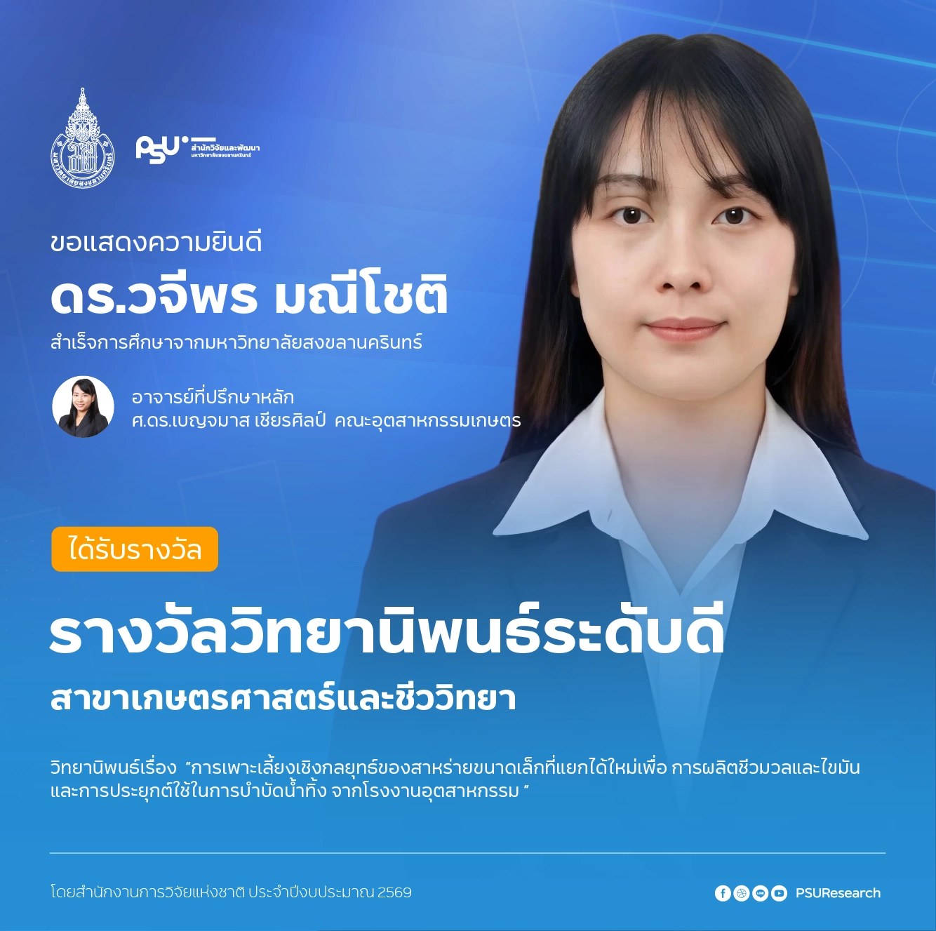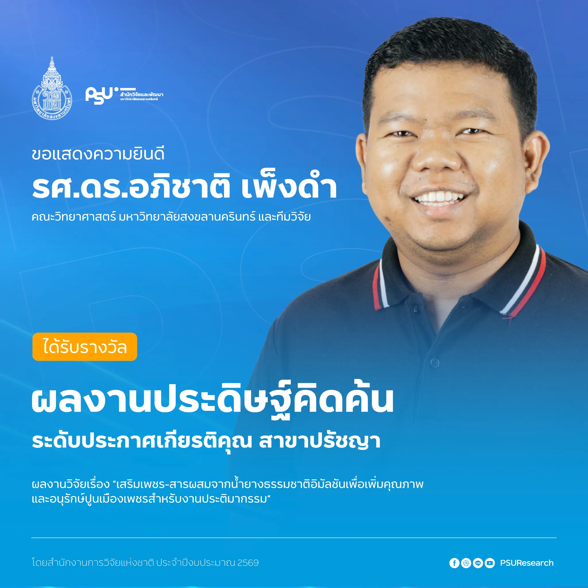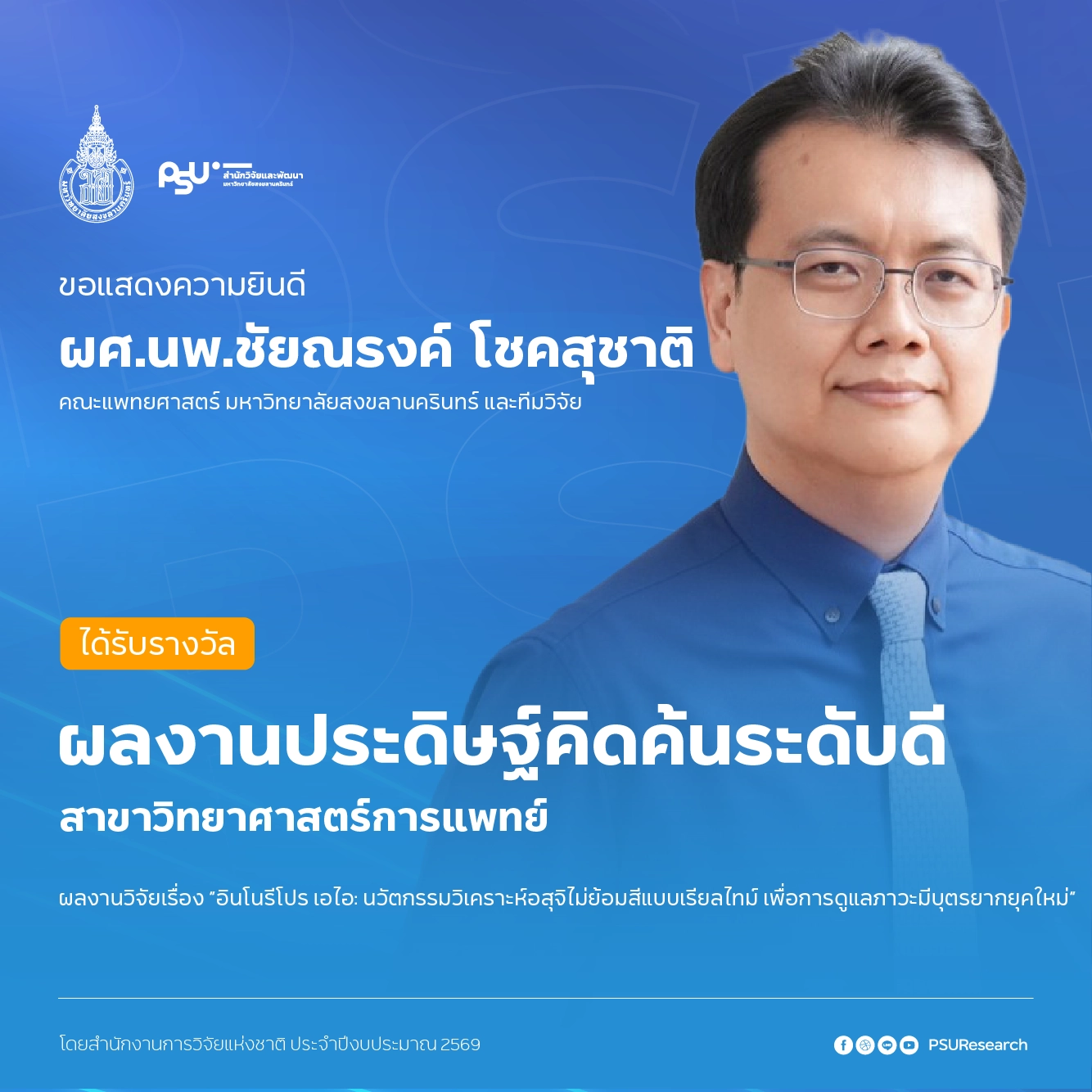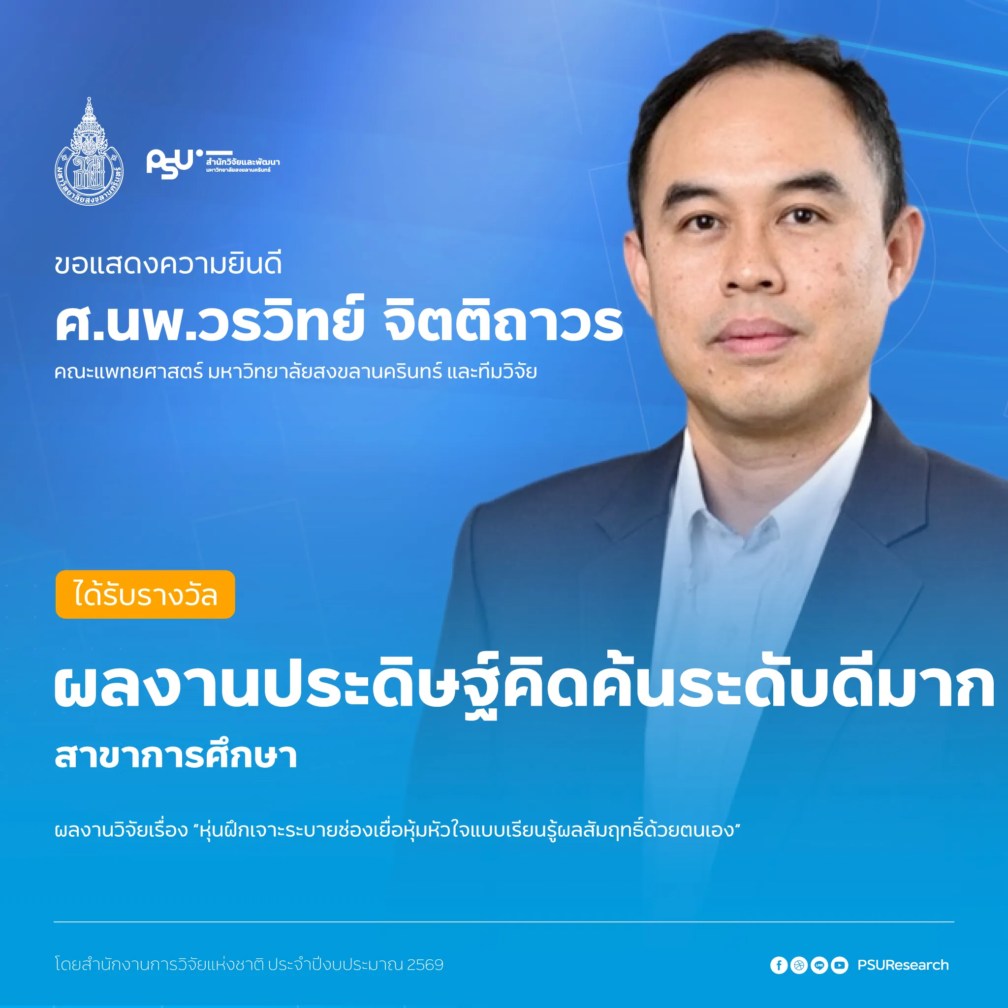 มหาวิทยาลัยสงขลานครินทร์ (ม.อ.) สร้างประวัติศาสตร์ความภาคภูมิใจบนเวทีระดับประเทศอีกครั้ง หลังจากสำนักงานการวิจัยแห่งชาติ (วช.) ประกาศผล “รางวัลการวิจัยแห่งชาติ ประจำปีงบประมาณ 2569” อย่างเป็นทางการ โดยในปีนี้บุคลากรจาก ม.อ. สามารถคว้าความสำเร็จมาได้รวมทั้งสิ้น 9 รางวัล ครอบคลุมทั้งรางวัลนักวิจัยดีเด่นแห่งชาติ รางวัลผลงานวิจัย รางวัลผลงานประดิษฐ์คิดค้น และรางวัลวิทยานิพนธ์