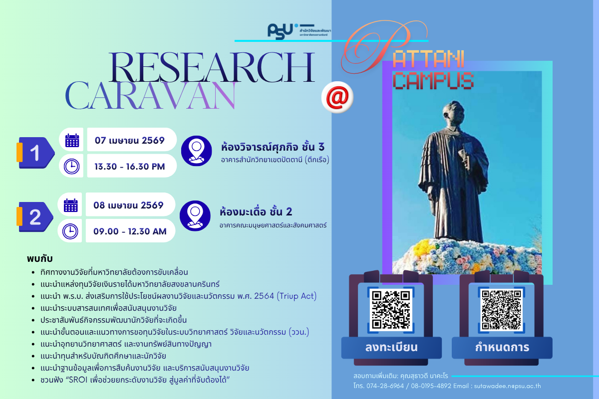 สอบถามรายละเอียดเพิ่มเติม คุณสินีนาฏ วัชราภรณ์ โทร.0-7428-6963 (ภายใน 6963) E-mail : sineenart.w@psu.ac.th