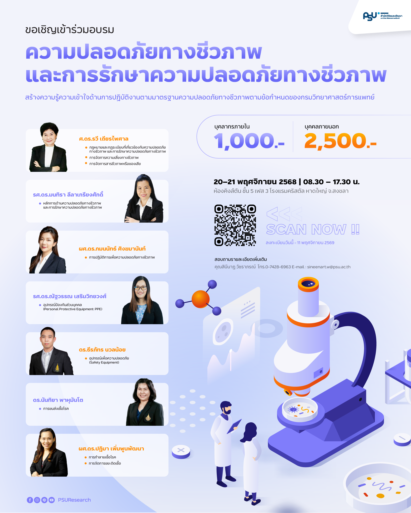 สำนักวิจัยและพัฒนา มหาวิทยาลัยสงขลานครินทร์ ขอเชิญผู้สนใจอบรมหลักสูตร “ความปลอดภัยทางชีวภาพและการรักษาความปลอดภัยทางชีวภาพ” มหาวิทยาลัยสงขลานครินทร์ เพื่อให้บุคลากรที่เกี่ยวข้องกับจุลินทรีย์ สารชีวภาพ และเทคโนโลยีชีวภาพสมัยใหม่ ได้มีความรู้ ความเข้าใจ และมีแนวทางในการปฏิบัติงานเพื่อความปลอดภัยทางชีวภาพและการรักษาความปลอดภัยทางชีวภาพ ตามข้อกำหนดของประกาศกรมวิทยาศาสตร์การแพทย์ ระหว่างวันที่ 20 – 21 พฤศจิกายน 2568 เวลา 08.30 – 17.30 น. ณ ห้องคิงส์ตัน ชั้น 5 เฟส 3 โรงแรมคริสตัลหาดใหญ่ อำเภอหาดใหญ่ จังหวัดสงขลา