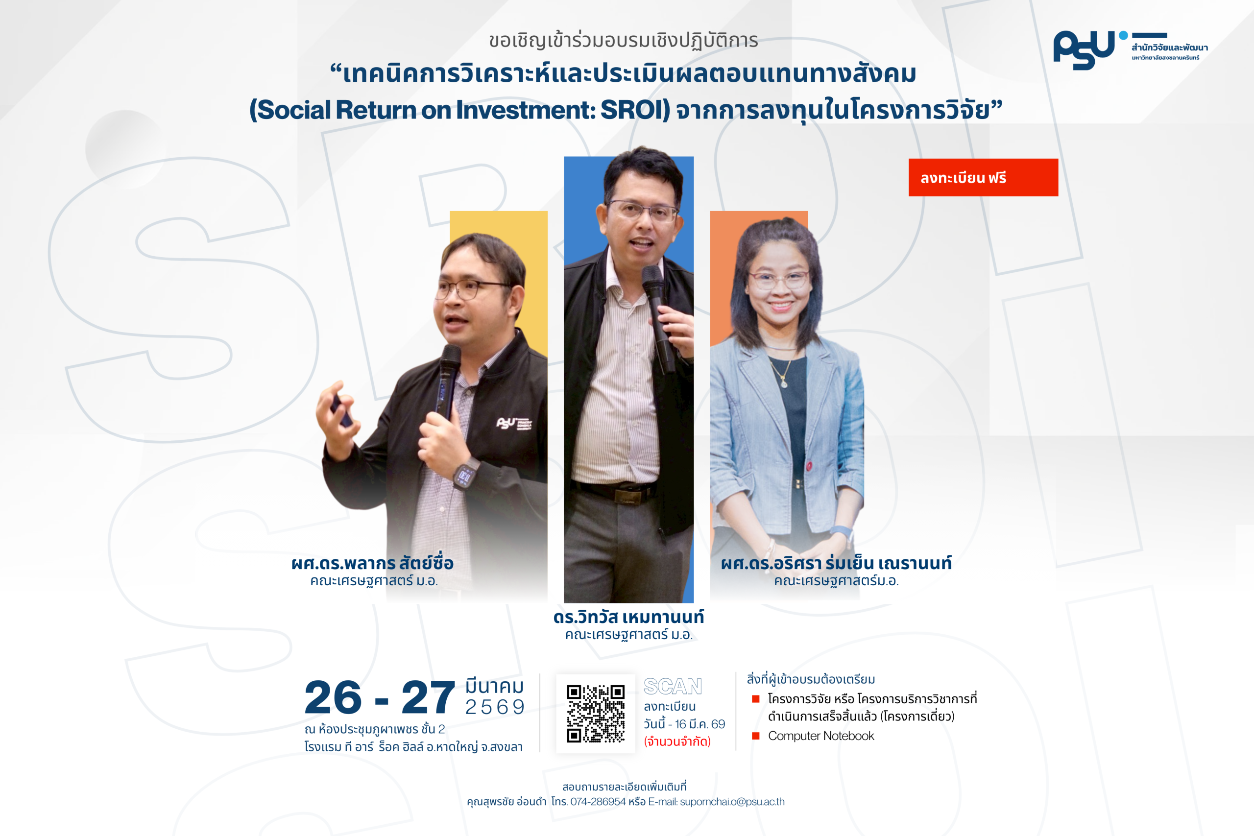 สำนักวิจัยและพัฒนา ขอเชิญอาจารย์และนักวิจัย ของมหาวิทยาลัยสงลานครินทร์ เข้าร่วมอบรมเชิงปฏิบัติการ “เทคนิคการวิเคราะห์และประเมินผลตอบแทนทางสังคม (Social Return on Investment: SROI) จากการลงทุนในโครงการวิจัย”