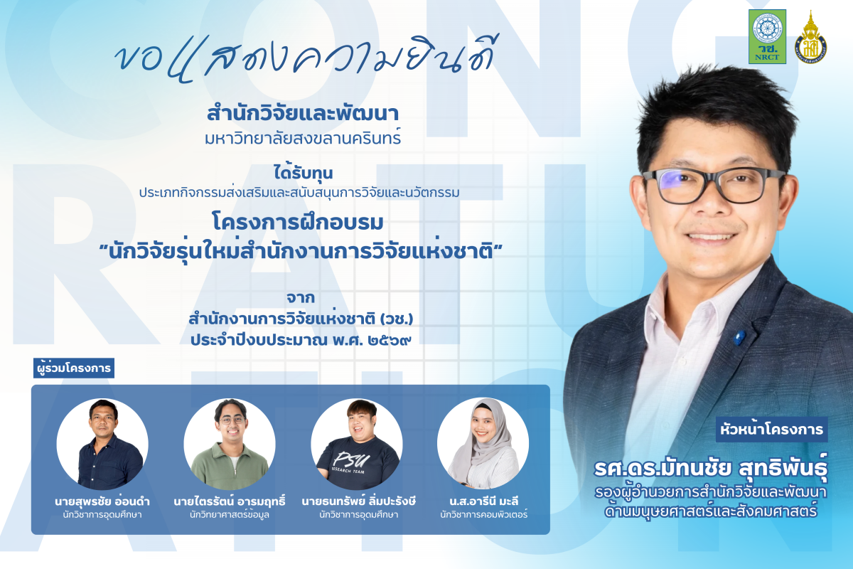 เรามีการใช้คุกกี้ที่มีความจำเป็นอย่างยิ่ง หรือเพื่อการทำงานของเว็บไซต์ และเครื่องมืออื่นๆ เพื่อช่วยเพิ่มประสบการณ์และเพื่อประสิทธิภาพในการใช้งาน คุณสามารถศึกษารายละเอียด นโยบายแนวปฎิบัติการใช้คุกกี้ มหาวิทยาลัยสงขลานครินทร์ ได้ที่ Cookies Policy