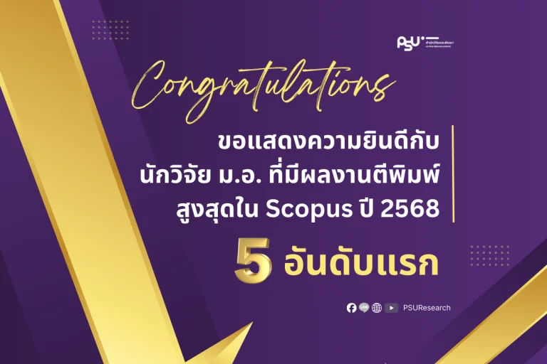 แสดงความยินดี 22 February 2026 5:44 PM ขอแสดงความยินดีกับนักวิจัย ม.อ. ที่มีผลงานตีพิมพ์สูงสุด 5 อันดับแรก ใน Scopus ปี 2568