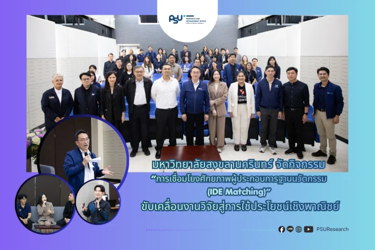 กิจกรรม 27 March 2026 1:53 PM มหาวิทยาลัยสงขลานครินทร์ จัดกิจกรรม “การเชื่อมโยงศักยภาพผู้ประกอบการฐานนวัตกรรม (IDE Matching)” ขับเคลื่อนงานวิจัยสู่การใช้ประโยชน์เชิงพาณิชย์